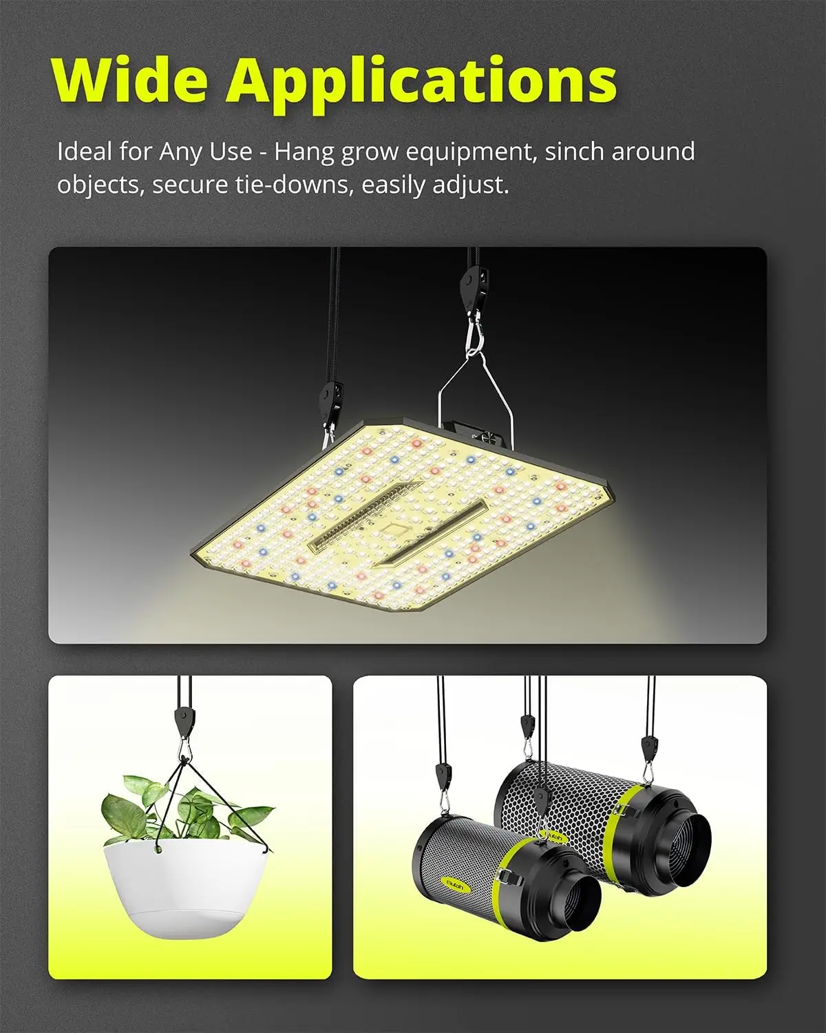 Discover the versatility and durability of our adjustable ratchet straps, designed to meet a wide range of needs. Here are the key features that make these straps an excellent choice: 1. **Durable Construction**: Crafted from solid woven polypropylene and equipped with durable metal gears, these straps offer reliable performance for long-lasting use. With a weight capacity of 75 lbs per strap, they provide superior strength to secure items during travel or outdoor activities. 2. **Easy Operation**: The ratcheting system is designed for simplicity, allowing you to quickly adjust and lock items securely in seconds without any tools required. This user-friendly design saves time and effort whether you're setting up a tent or hanging plants. 3. **Multi-Purpose Application**: These straps are perfect for various applications including hanging plants and grow lights, anchoring camping tents, securing kayak accessories, and performing tie-down work for multiple tasks around the home or outdoors. 4. **Convenient Pack**: You will receive a 4-pack of these versatile straps, ensuring you have enough for different projects or replacements as needed. 5. **Reliable Performance**: Built with premium materials that enhance reliability, these straps can confidently handle securing items during your adventures or daily use. 6. **Versatile Use Cases**: Ideal for outdoor enthusiasts, gardeners needing plant support, campers requiring tent stability, kayakers securing gear, and anyone involved in tie-down work that demands strong and adjustable solutions. 7. **Quality Assurance**: We stand by the high quality of our ratchet straps to ensure your complete satisfaction with every purchase. 8. **Detailed Specifications**: Each strap measures 10 ft in length when fully extended and can be adjusted to shorter lengths as needed using the ratcheting mechanism. 9. **Safety Features**: The metal gears provide smooth operation while maintaining secure locking to prevent slippage under load conditions up to 75 lbs per strap. 10. **Customer Benefits**: Enjoy peace of mind knowing these straps are built to last through repeated uses across various environments without compromising on performance or ease-of-use.
